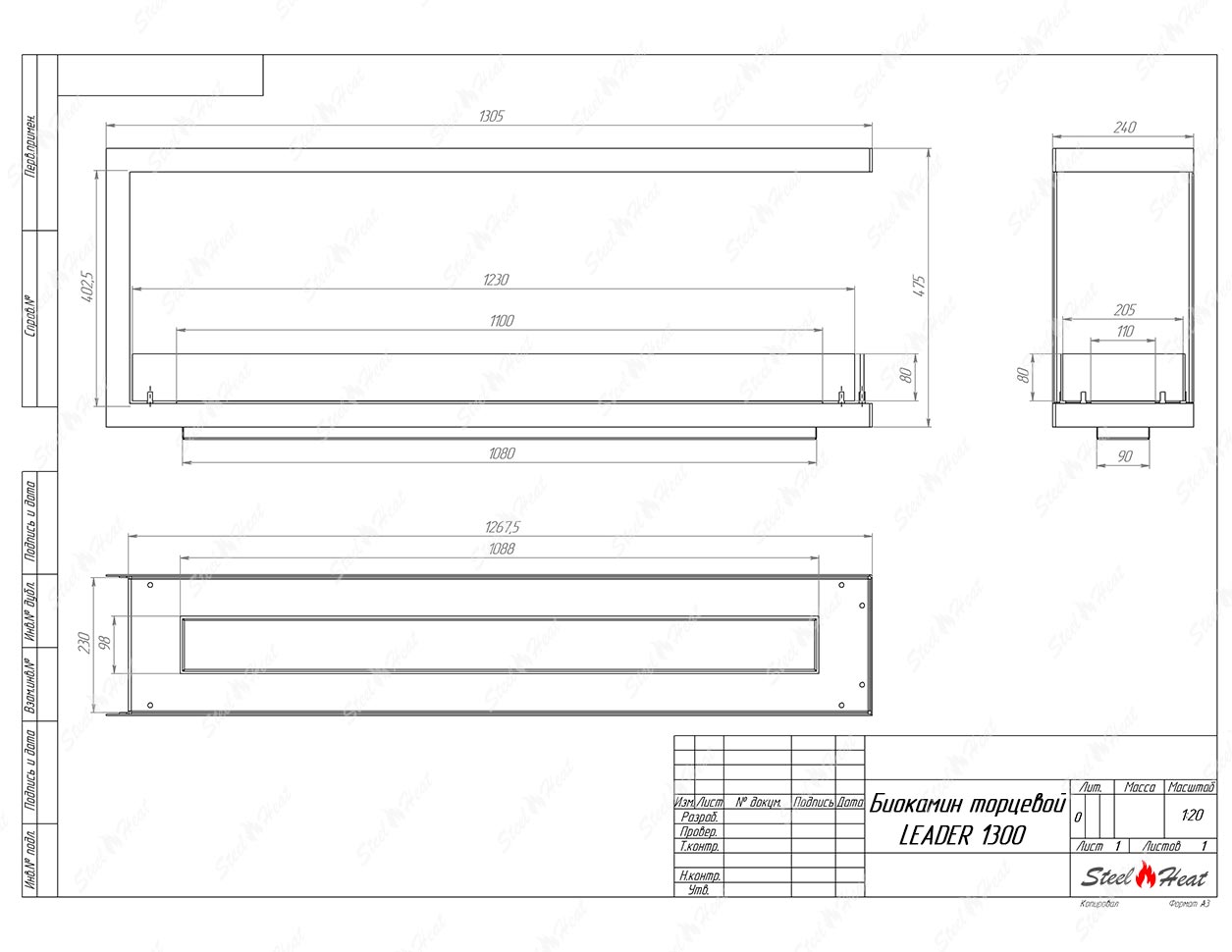 Встраиваемый Биокамин торцевой SteelHeat Leader 1300предназначен для встраивания в глухие ниши из гипсокартона, кирпича, пеноблоков, бетона.