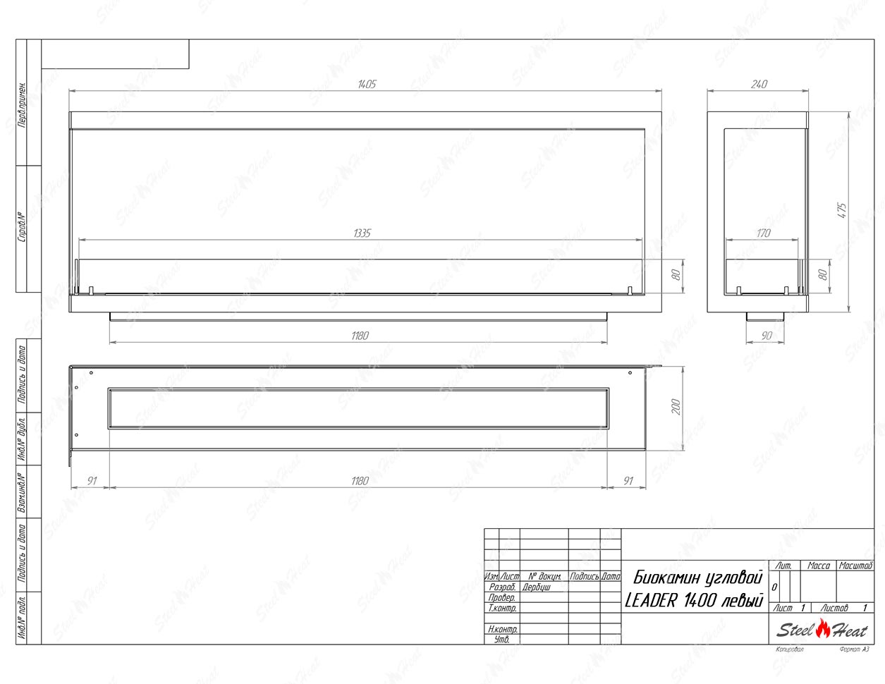 Встраиваемый Биокамин угловой SteelHeat Leader 1400 левый предназначен для встраивания в глухие ниши из гипсокартона, кирпича, пеноблоков, бетона.